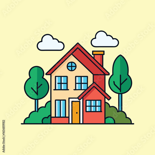 house, home, building, dwelling, residence, two-story, yard, garden, tree, bush, plant, cloud, sky, architecture, design, illustration, cartoon, graphic, property, real estate, roof, window, door, chimney, family, neighbourhood, suburb, residential, outline, vector, art, modern, style, simple, cute, colourful
