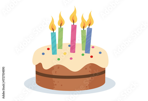 Illustration of a Delicious Chocolate Cake with Colorful Frosting and Five Lit Birthday Candles for a Festive Celebration