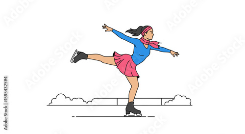 Illustration of a Female Figure Skater Performing a Graceful Pose on Ice in Vibrant Colors