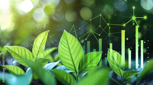 Illustration of a financial report with vibrant green leaves and upward-trending bar charts, symbolizing the positive impact of eco-friendly investments and sustainable financial strategies