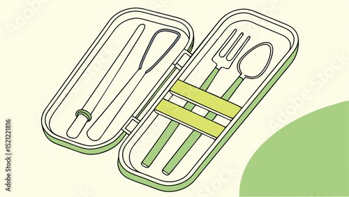cutlery, recyclable, green, fork, spoon, knife, chopstick, case, travel, portable, environmentally friendly, sustainable, lunch, picnic, bento, container, utensil, tableware, dining, food, kitchen, flatware, set, carry, convenient, lightweight, compact, organised, storage, minimalist, clean, modern, design, illustration, drawing, clip art, graphic, art, vector, outline, eating, meal
