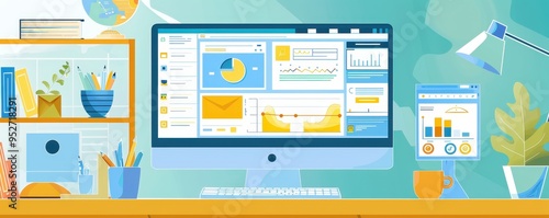 illustration, home, office, computer, screen, display, analytic, datum, visualisation, honed, management, software, connection, statistic, market, concept, equipment, workflow, remote, setup, desktop, event, workspace, progress, process, tablet, device, insight, cyberspace, laptop, diagram, furniture, monitor, study, finance, overview, notebook, factor, inspecting, platform