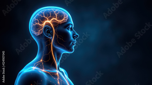 Illustration of a human head with highlighted VNS (Vagus Nerve Stimulation) pathways.