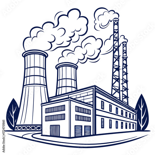 Illustration of a large industrial complex with cooling towers and smokestacks, symbolizing energy production, manufacturing, and the generation of electricity