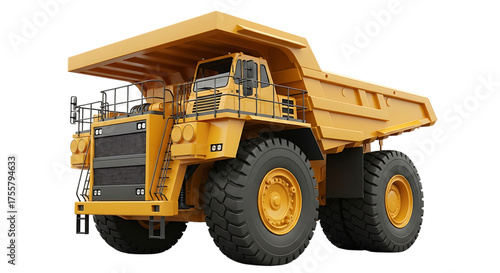 Illustration of a massive yellow mining dump truck with huge tires and a large bed, designed for heavyduty construction and excavation, isolated on transparent background on transparent background