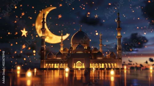 illustration, mosque, moon, star, islamic, architecture, religious, crescent, decorative, spiritual, elegant, beautiful, artistic, detailed, celestial, gold, night sky, traditional, sacred, cultural, minaret, dome, prayer, ornamental, worship, holy, festive, intricate, faith, spirituality, night, shining, starry, ornate, lunar, illuminated, celebration, heritage, devotion, serene