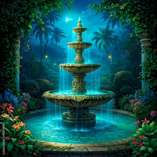 fountain, illustration, fantasy, drawing, water, digital artwork, vegetation, colourful, shine, palm tree, landscape, night, garden