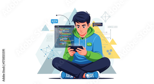man, coding, tablet, sitting, cross-legged, illustration, young, technology, computer, screen, code, programming, developer, software, digital, design, graphic, art, vector, person, male, student, learning, education, online, cyberspace, application, website, development, programmer, device, portable, casual attire, style, modern, creative, concept, freelancer, work, job, occupation, career, skill, cognition, information, network, communication, connection, triangle