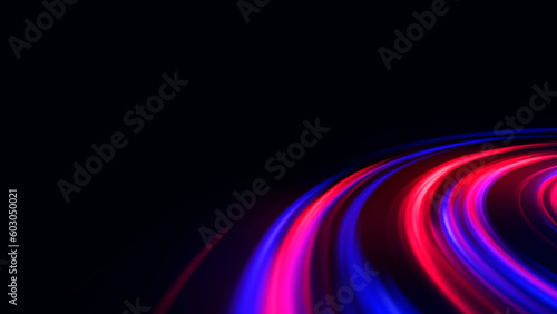 Illustration of abstract neon background with red and blue glowing lines. Fantastic wallpaper with colorful laser rays.
