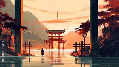 Illustration of beautiful view of Itsukushima Shrine, Japan