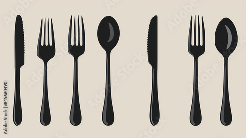Illustration of black silhouette cutlery set with forks, knives, and spoons on a beige background. Perfect for culinary and kitchen design projects.