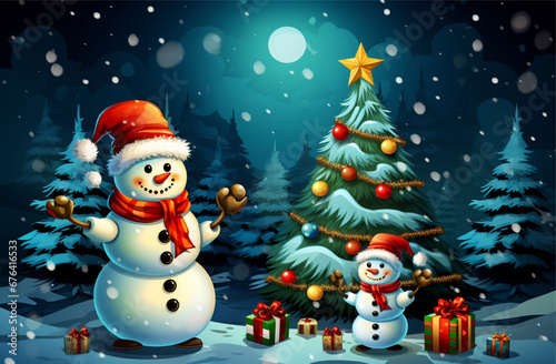 illustration of clipart christmas with cartoon snowmen and christmas tree