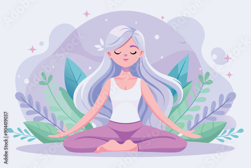 Illustration of cute girl meditating in lotus pose with green plants on the background