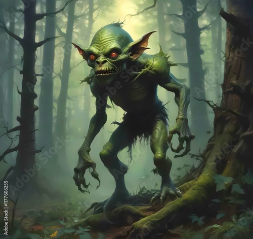 Illustration of goblin in wild forest.