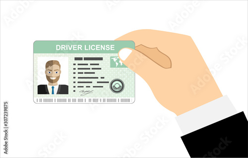 Illustration of hand holding the car driver license identification card with photo. Vector illustration flat design.