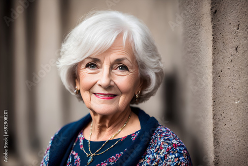 Illustration of happy woman wearing jewellery. Short, grey hair. Generative AI.
