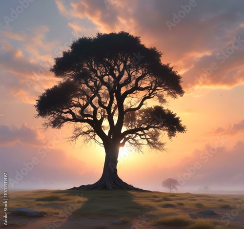 Illustration of lonely tree with sunrise behind and fogy landscape.