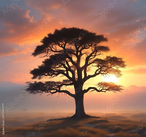 Illustration of lonely tree with sunrise behind and fogy landscape.