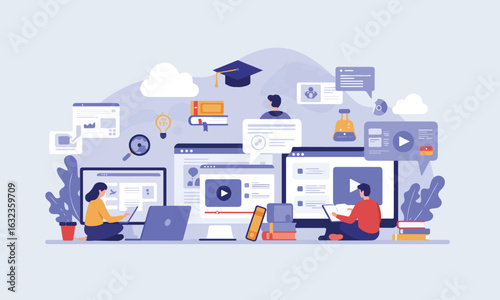 Illustration Of Online Learning Environment With Students And Teachers Suitable For E-Learning Platforms And Education Startups