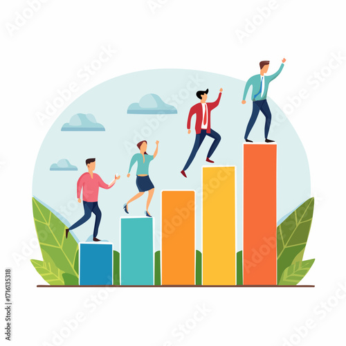 achievement, ambition, ascent, bar, business, career, chart, climb, climbing, competition, concept, corporate, development, employee, growth, illustration, improvement, ladder, leader, leadership, management, manager, motivation, opportunity, people, person, progress, promotion, rise, solution, staff, strategy, success, team, vector, way, work, men at work, goal, target, up, finance, economy, market