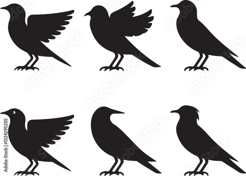 Illustration of six black bird silhouettes in three rows on a light white background. Birds in different postures and styles