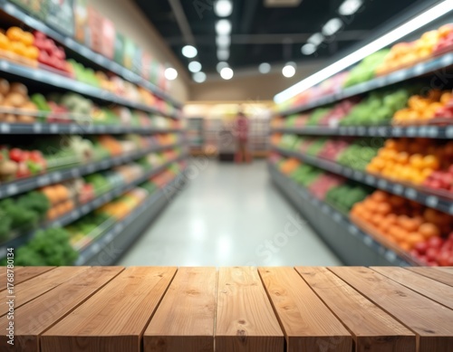 Illustration of supermarket produce aisles with blurred background. Foreground shows wooden table for food ads. Fruits and vegetables are on display in grocery store.