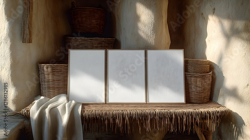 Illustration of Three Blank Canvases, Wicker Baskets, Linen Cloth, and Sunlight on Wall