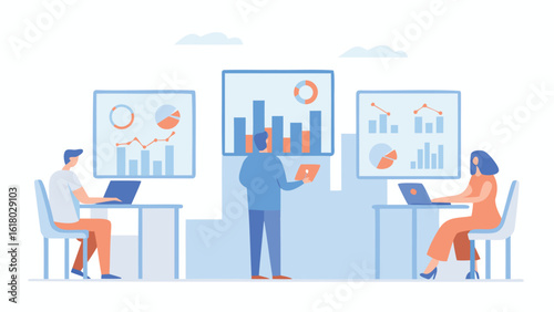 illustration, people, datum, chart, laptop, office, environment, modern, business, teamwork, presentation, graph, statistic, workspace, meeting, technology, communication, collaboration, design, corporate, professional, screen, desk, chair, employee, analysis, report