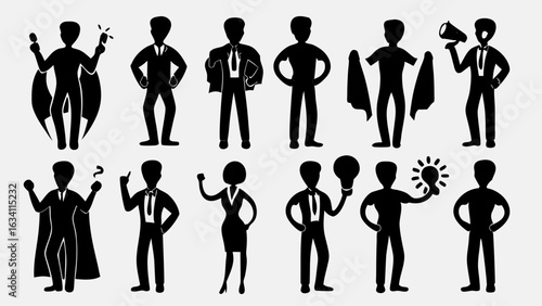 business, people, silhouette, pose, object, man, woman, suit, attaching, cape, light bulb, megaphone, idea, leadership, success, achievement, motivation, innovation, power, authority, confidence, professional, corporate, career, job, employee, boss, manager, leader, speaker, presentation, announcement, promotion, vision, strategy, planning, goal, target, growth, opportunity