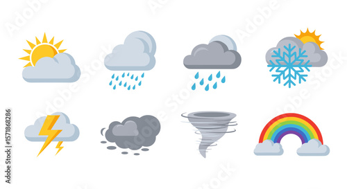 weather, sun, cloud, rain, snow, lightning, tornado, rainbow, wind, sunny, storm, climate, forecast, nature, sky, meteorology, season, day, night, cold, warm, wet, dry, hazard, natural, element, graphic, cartoon, illustration, design, symbol, icon, elemental, atmosphere, precipitation, snowflake, thunder, whirlwind, arch, colours, spectrum, breeze, gust, weathering, climate change, atmospheric, pattern, condition, outdoors