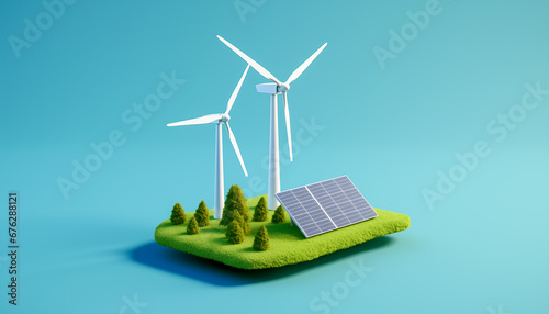 Illustration of wind power farm. Wind energy turbines and solar panel on green island in front of blue backdrop.