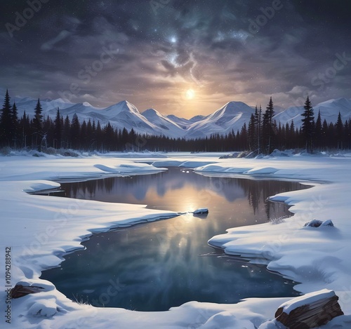 Illustration of winter landscape with frozen lake and starry sky.