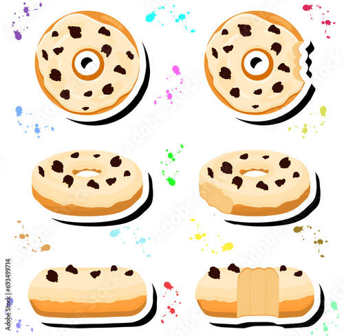 Illustration on theme big set different types sticky donuts, sweet doughnuts various size