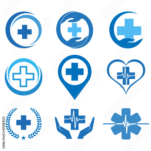Illustration set of healthcare logos.Blue medical cross with a pulse on a white background