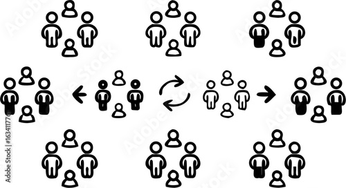 Illustration showing groups of people with arrows depicting movement and transformation processes shown here | editable eps vectors