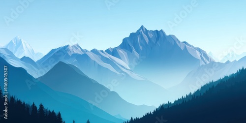 Illustration showing mountain range with pine trees under a light blue sky in a scenic landscape