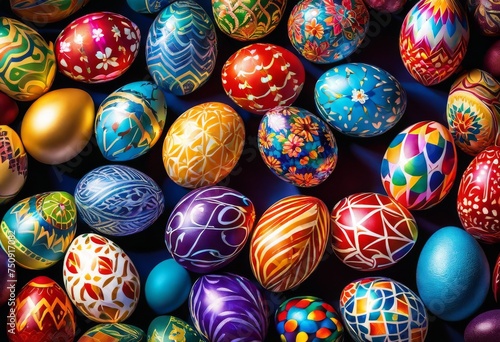 illustration, vibrant close photography decorated easter eggs featuring spectrum colors intricate patterns, artistic, backdrop, bright, celebration, colorful