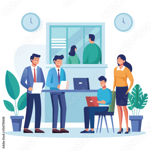 office, teamwork, business, collaboration, workspace, meeting, staff, employee, work, desk, laptop, computer, presentation, document, interior, clock, time, schedule, illustration, vector, graphic, design, flat, style, people, professional, transparency, white background