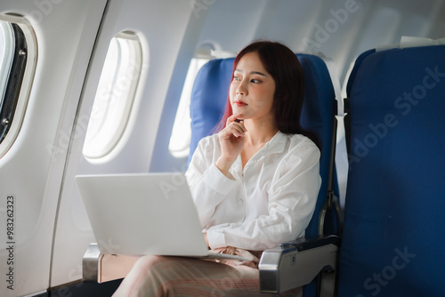**Image Name:** Window Seat Ponderings: Businesswoman Contemplates During Flight **Tags:** businesswoman, laptop, airplane, travel, business, flight, window seat, thinking, contemplating, work, re