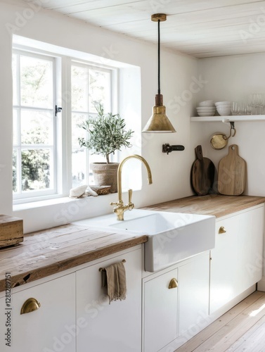 interior, design, kitchen, decor, brass, wood, white, modern, clean, simple, contemporary, stylish, pendant, light, gold, faucet, rustic, sink, cabinet, style, window, plant, farmhouse, lighting, hardware, handle, cooking, shelf, classic, house, new, vintage