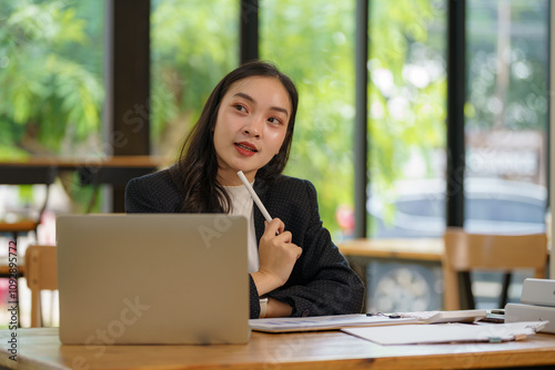 Image of a young, beautiful, brooding Asian woman working with a laptop while sitting at a computer in the office, thinking of professional plans, project management, and considering new business idea