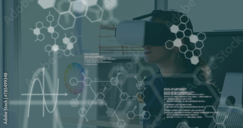 Image of chemical compounds and medical data processing over woman wearing vr headset