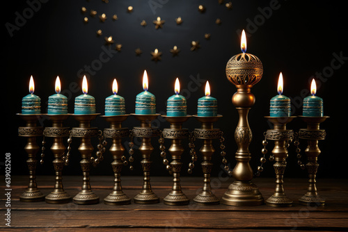 Image of Jewish holiday Hanukkah with a menorah (traditional candelabra) and spinning top over a wooden blue background. Top view, flat lay. Generative Ai.