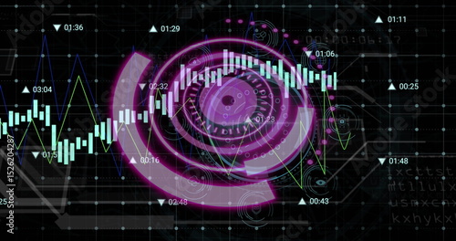 Image of purple circle, numbers and graphs on black background