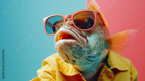 image, stylish, piranha, trendy, sunglasses, outfit, look, camera, 2, coloured, expression, wildlife, model, animal, copy space, portrait, background, modern, designer, character, art, stare, accessory, tropical, glamour, stripes, funky, attitude, charme, fauna, artistic, exotic, coolness, teeth, fashionable, pattern, contrast