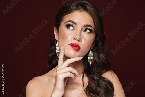 woman, face, posing, closeup, brunette, health, skin, caucasian, female, background, wall, isolated, young, portrait, girl, honed, body, care, adorable, beautiful, cute, shirtless, attractive, make-up, posh, fashion, stylish, gorgeous, glamour, glamourous, sexual, seductive, half-naked, copy space, visage, red, lip, burgundy, maroon, curly, long hair, looking, serious, thinking, confused, perplexed, earring, jewellery
