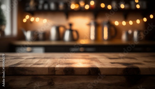 image of wooden table in front of abstract blurred background of coffee shop lights.Blur coffee shop or cafe restaurant with abstract bokeh light background.