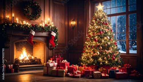 christmas, tree, chimney, room, vacation, christmas tree, house, decoration, fire, celebration, insides, light, winter, gift, present, santa, evening, living room, ornament, window, family, season, december, religion, happy, fir, ball, box, star, new, year, new year, pine