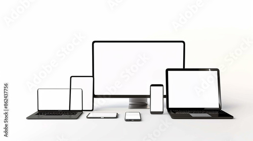 images showcasing various electronic devices, including laptops, desktop monitors, tablets, and smartphones, all with blank screens, illustrating modern technology and device variety