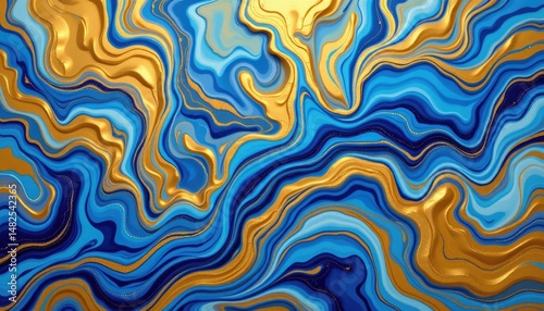 imagine a mesmerizing abstract fluid art piece that captures the essence of opulence and playfulness, picture vibrant blue and gold swirls dancing across the canvas